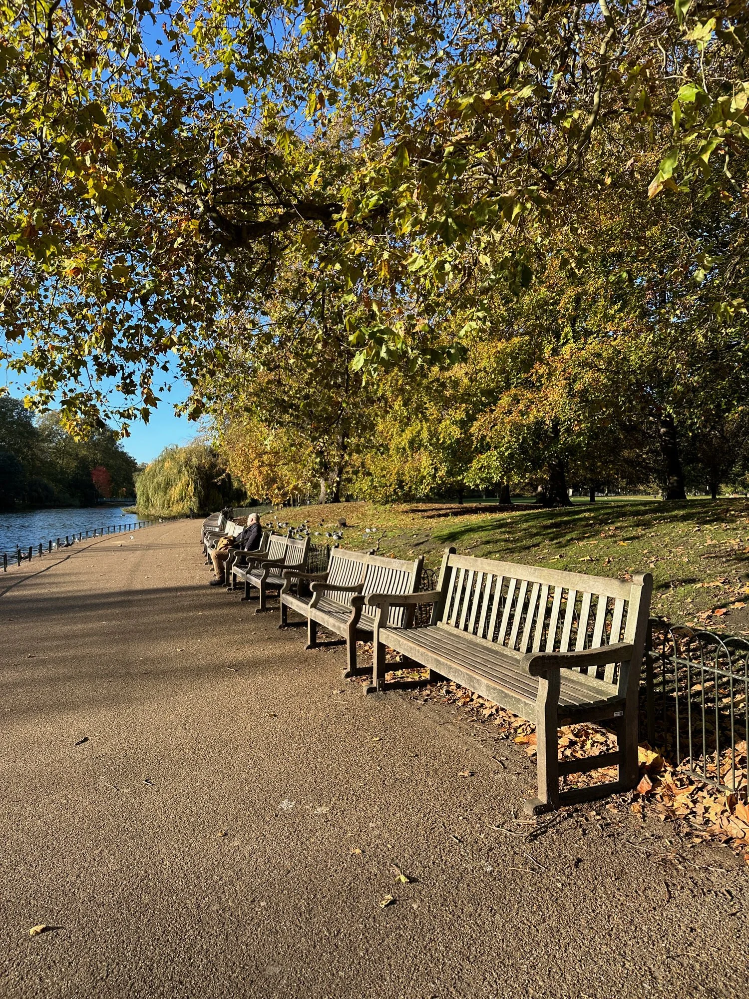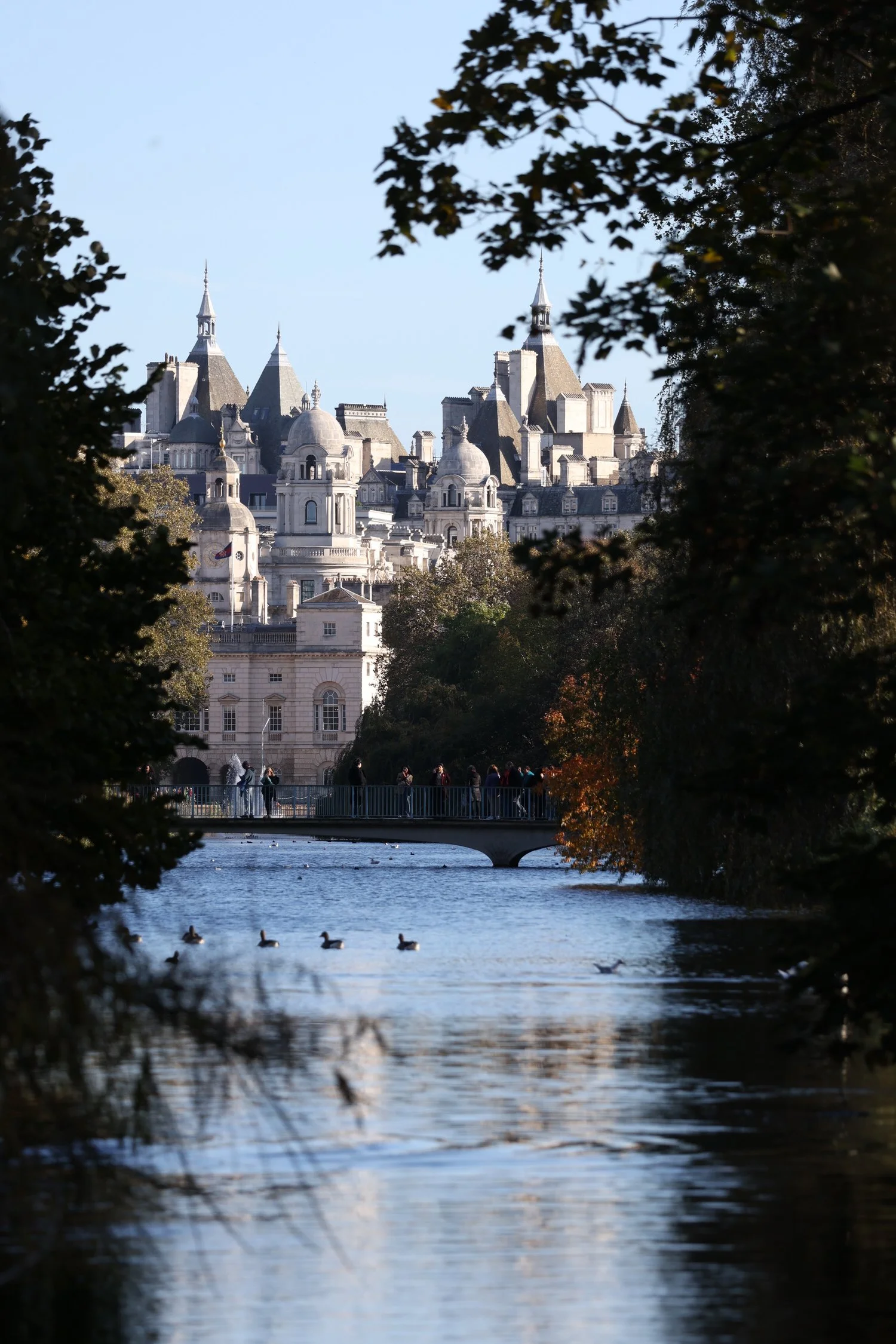 The park is centred around a beautiful curving lake. A modest blue bridge crosses the lake about midway along and if you stand on that bridge you can see Whitehall Palace and the London Eye at one end and Buckingham Palace at the other.