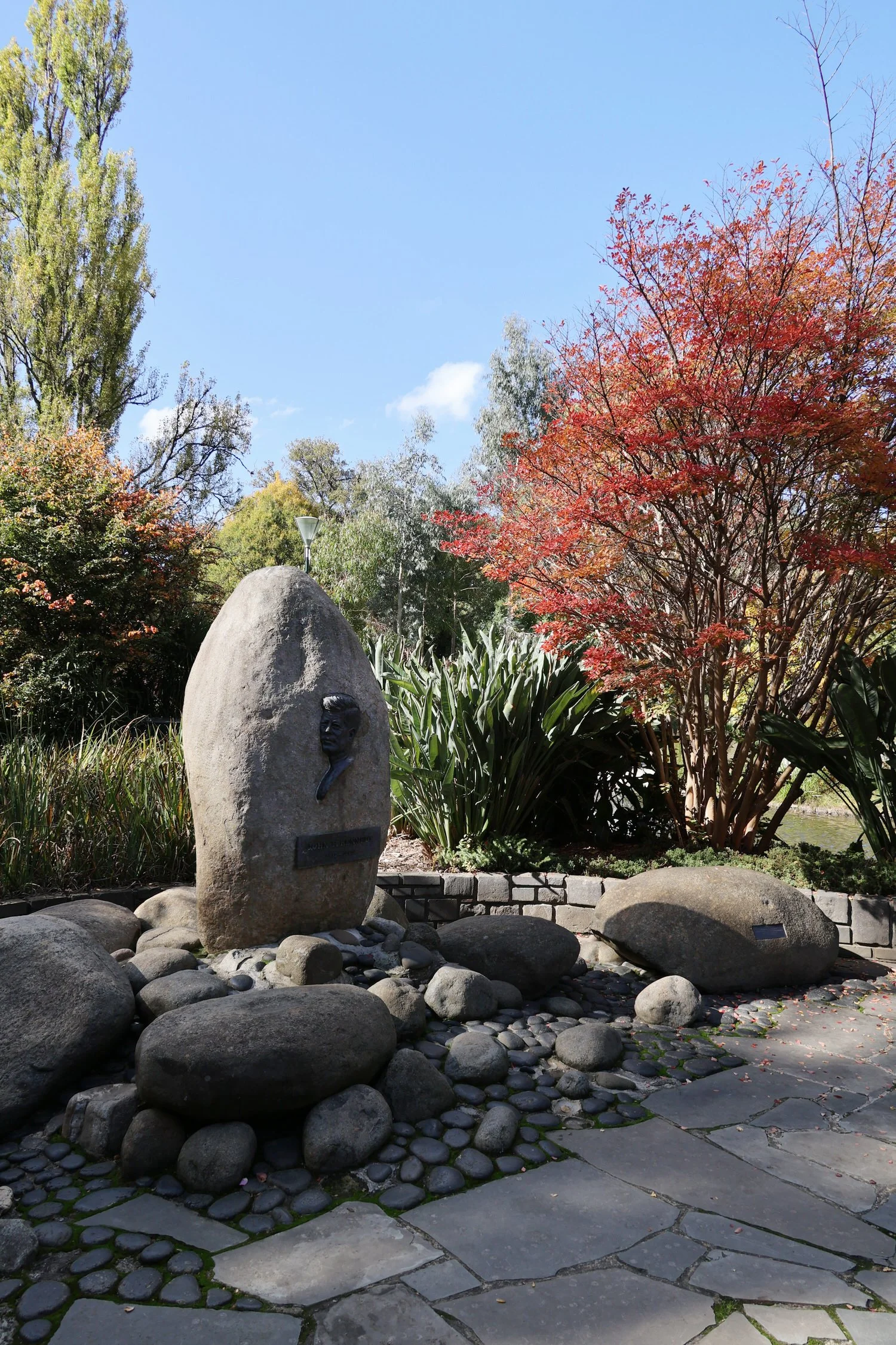 There are a number of memorials in the Gardens, mostly centred around the pond. The Victorian Emergency Services Memorial honours fallen members of all of the state’s emergency services organisations. There is a memorial to poet Robert Burns and one to former US President John F Kennedy. Elsewhere in the park is a mounted bust of colonial businessman and philanthropist Sir William Clarke.