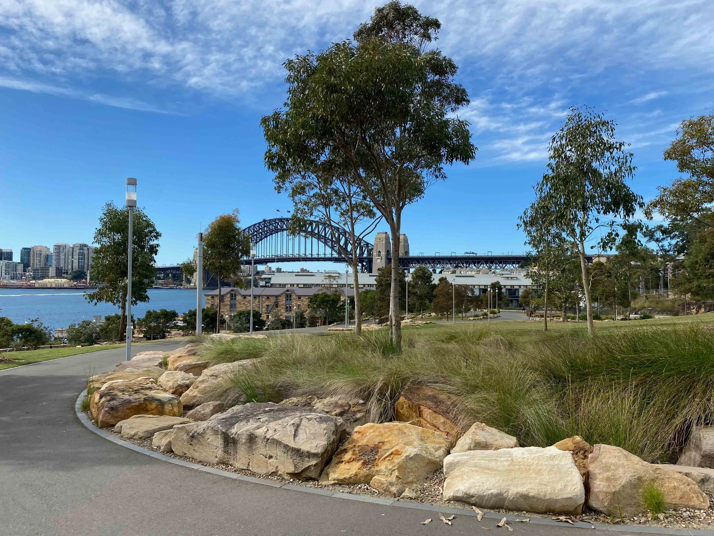 Wide paths, sandstone terraces and native plantings create a multi-levelled harbour park with sweeping views. Paths and lifts make access easy for prams and wheelchairs.