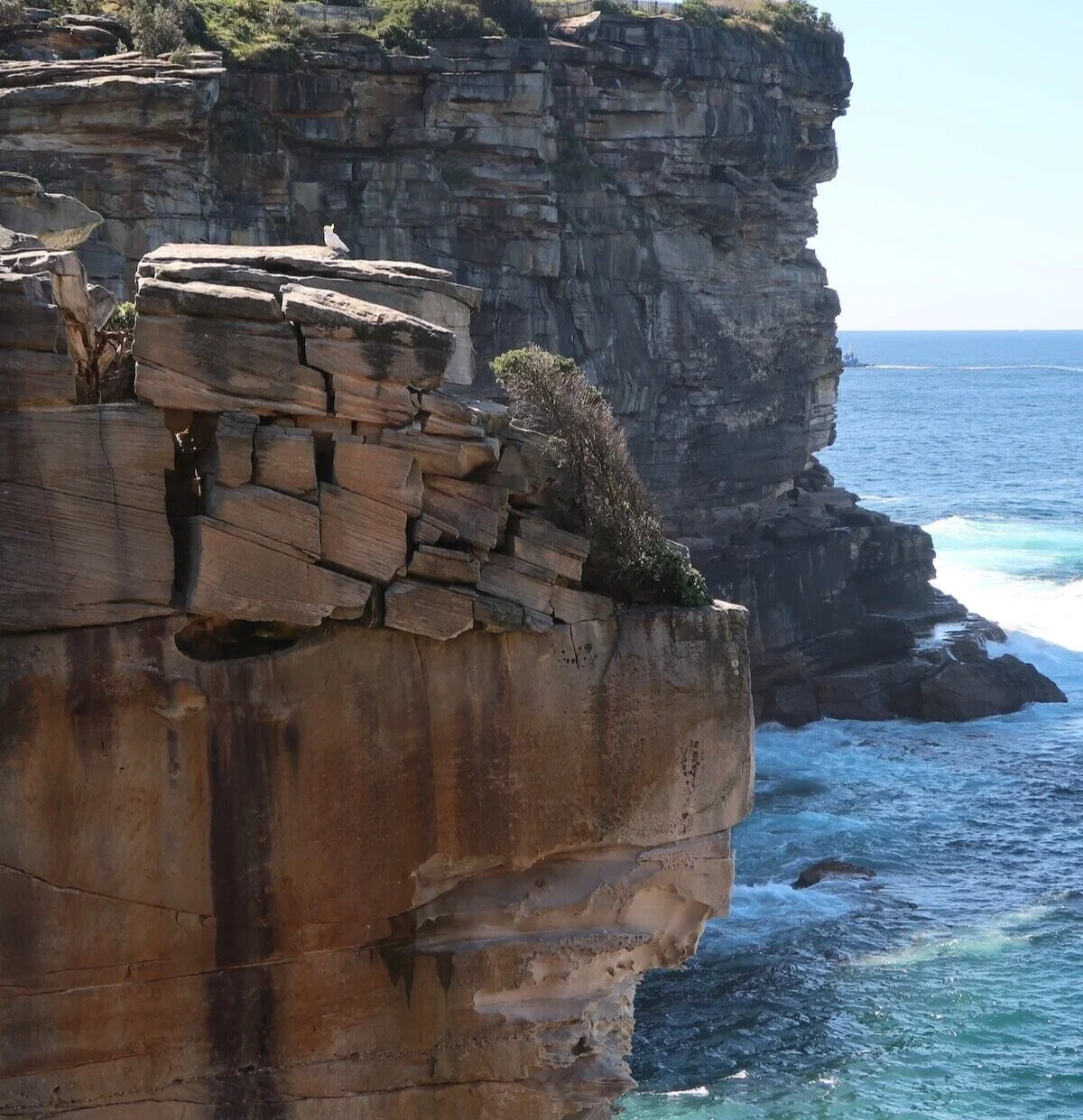 This is my favourite part of the walk. Birds wing their way between soaring sandstone cliffs and the clifftop path curves out over the ocean, with turquoise water and white foam far below.