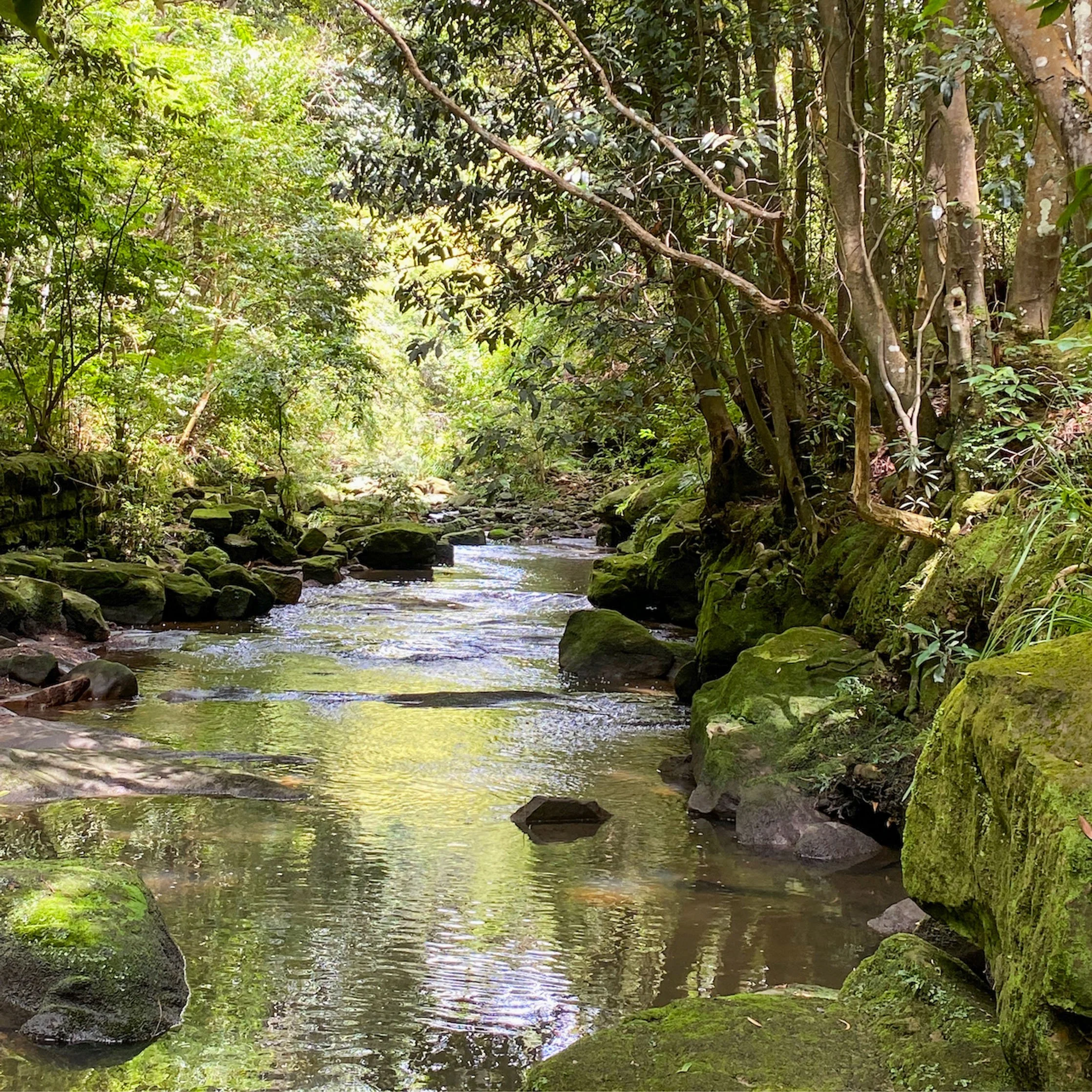 The first crossing sits at a particularly beautiful low point in the gully, where filtered light sparkles on the water and the air feels fresh and cool. After crossing the flat rocks here, turn left and follow the path to a second crossing via stepping stones, continuing on towards Tunks Park.
