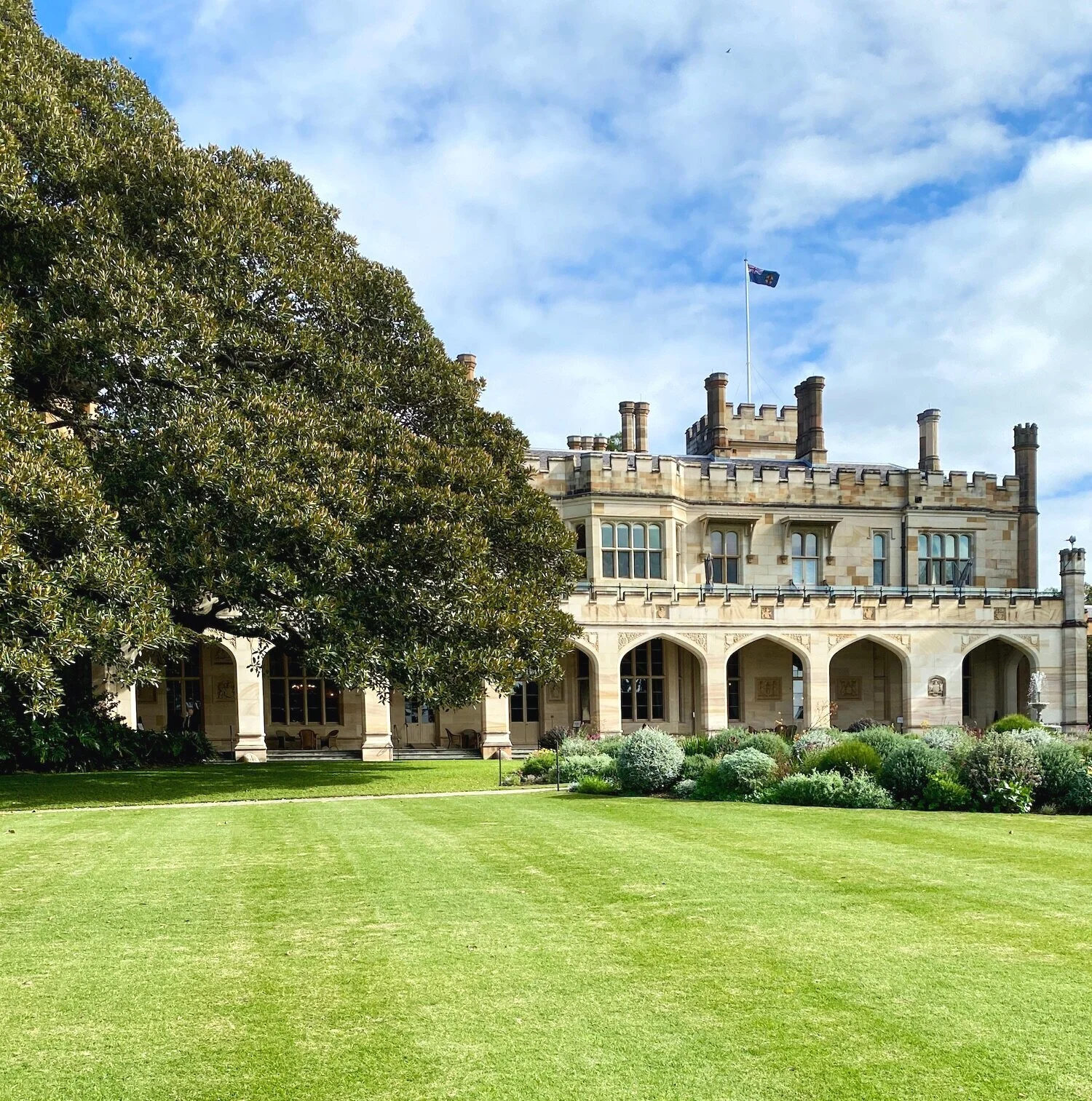 Government House sits on the edge of the Botanic Gardens with the Opera House at its back door.
