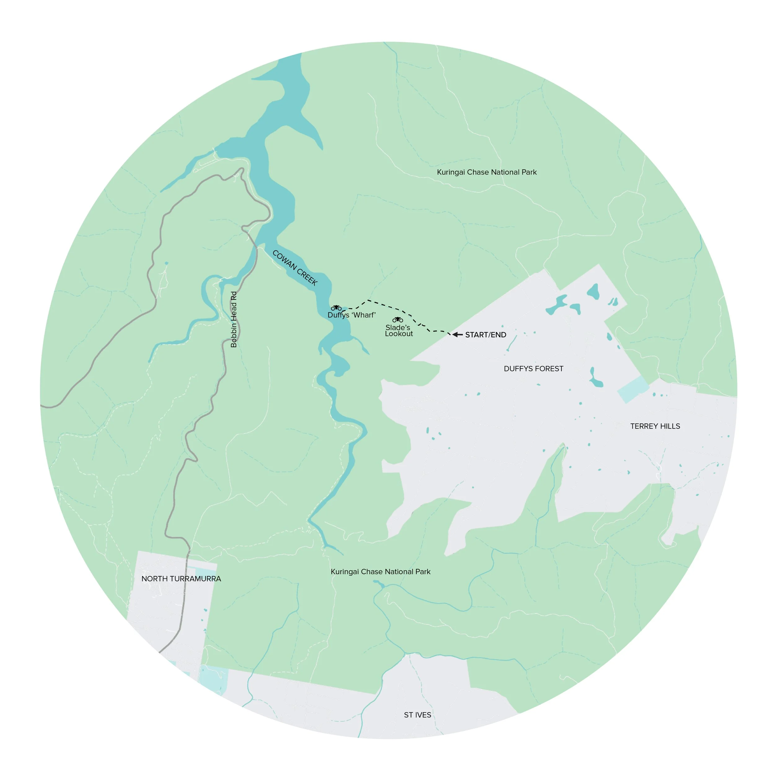 Follow the trail leading to Slades Lookout and Duffys Track and then turn right at the sign to Duffys Wharf .